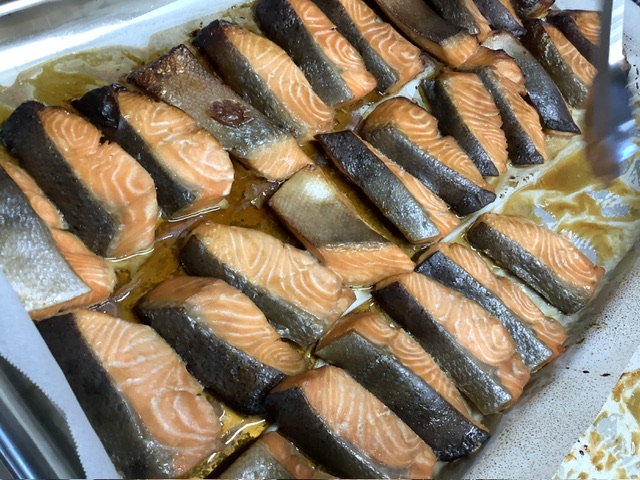 山口水産から届いた鮭を、酒、醤油、みりんに漬け込みました。