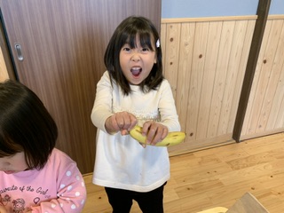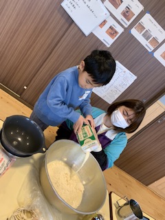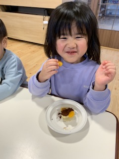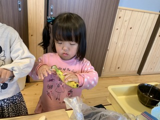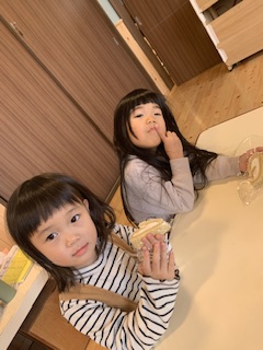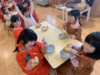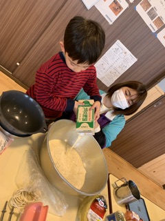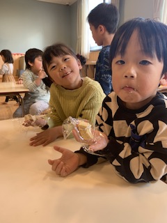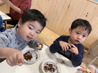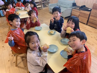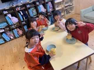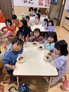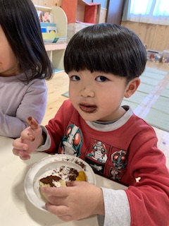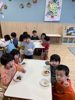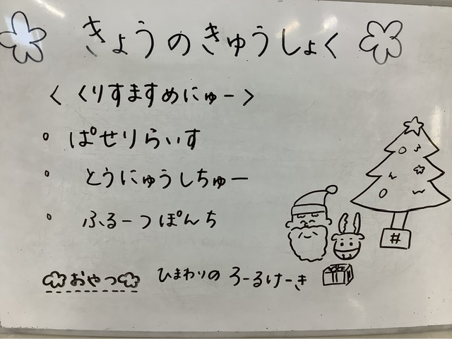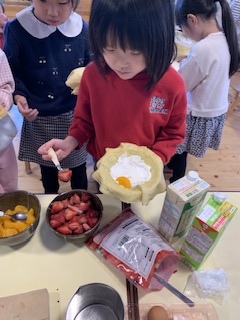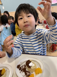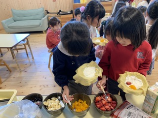 クリスマスということで、さくら組はクレープ作り、きく組はおやつのロールケーキにトッピングをして楽しんでいました。
