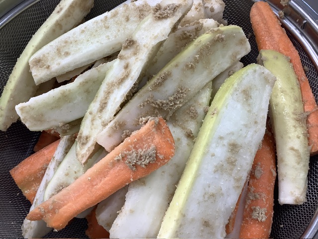 35ファームの大根とにんじんをよく洗い、ぬか床に漬け込みました。