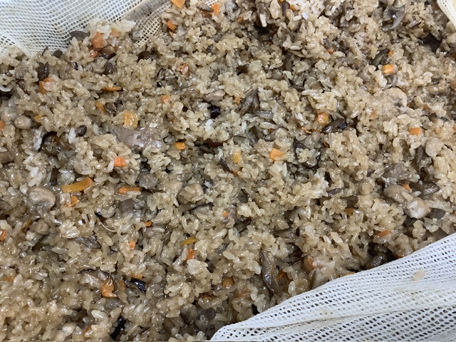 鶏肉、戻した干ししいたけ、蒸しごぼう、35ファームのにんじんを炒めて、しいたけの戻し汁と調味料、もち米を炒めます。汁気を全部もち米に吸わせ、もち米が半透明になるまで炒めます。