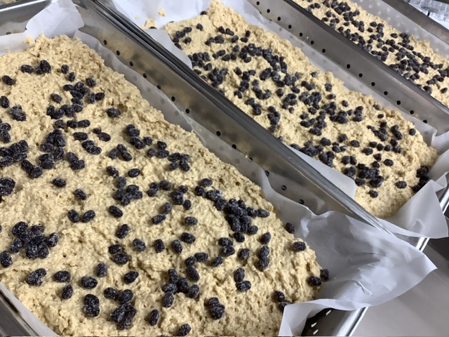 小麦粉、きな粉、きび糖、豆乳を混ぜ合わせ、鉄板に伸ばし、最後に甘納豆をのせて蒸しました。