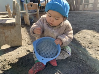 手先が器用になってきていることもあり木の枝を砂の山にさしたり、石だけをお皿に移したりすることも…