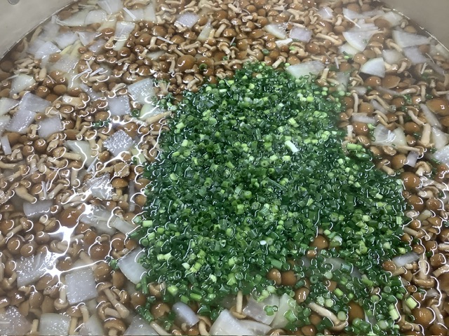 昆布とかつお節でじっくりととった出汁に、なめこ、えのき、小ネギ、 35ファームの大根が入りました。なめこを加えることで、トロっと口当たりが良く、美味しいすまし汁に仕上がりました。