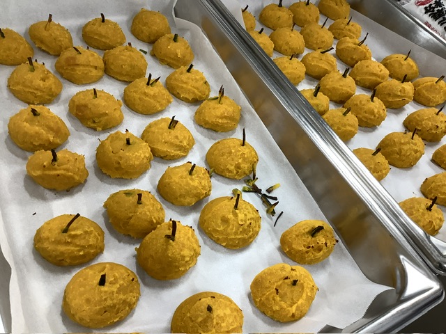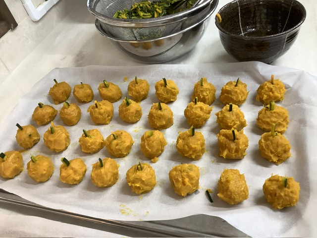 7キロのかぼちゃを使用しました。バター、きび糖、卵を加えます。かぼちゃの皮をヘタに見立て、成形しました。可愛い形に、子どもたちも喜んでくれましたよ。