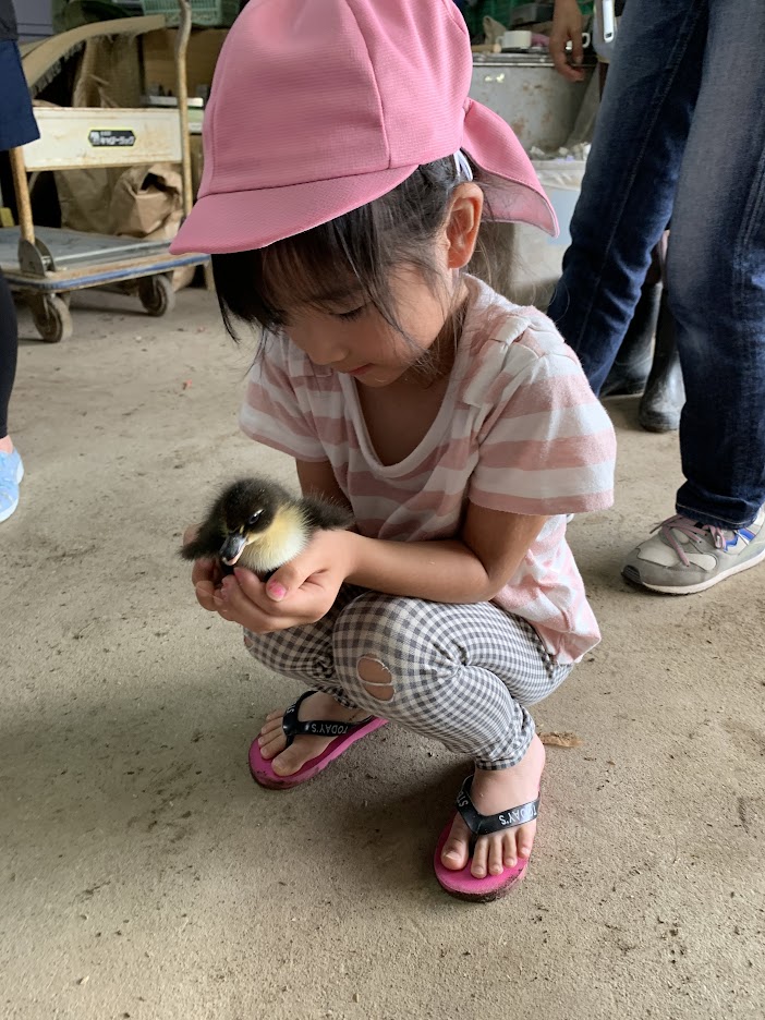 橋口農園には様々な生き物がおり、合鴨やヤギ・虫などたくさんの命に触れることができました。実際に合鴨の雛に触れる中で、クラスでは小さい生き物(カナヘビ・コザクラインコ・てんとう虫 など)を育てた経験を通して、扱い方に気を付けている様子が見られていました。