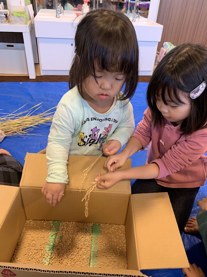 一粒一粒を大切にし、脱穀していく子ども達。脱穀するのは意外と難しく、最初は苦戦する様子もありましたが、回数を重ねていく内に少しずつコツを掴み楽しそうに取り組んでいました。