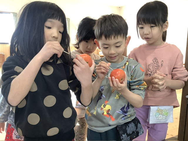 洗ったトマトに爪楊枝で数か所、穴をあけます。さすが年長クラス、とても器用に穴をあけていました。
