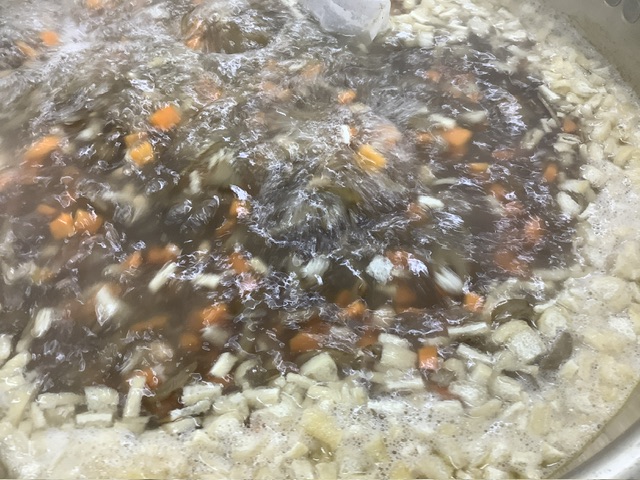 昆布・かつお節・いりこで出汁を取り、柔らかく茹でた大豆・蒸し煮をしたごぼう・油揚げ・にんじん・かぼちゃが入っています。