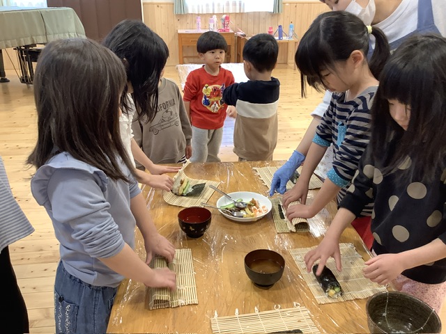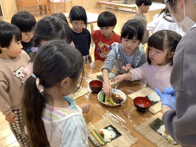 もも組とさくら組の子どもたちは、今日の巻き寿司を自分たちで手作りしました!