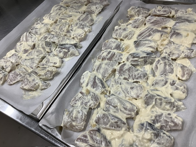 山口水産の新鮮なさわらを使用し、手作り豆乳マヨネーズと味噌を合わせたものを漬け込みます。