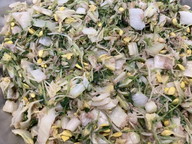 豆苗、白菜、大豆もやし、ツナが入り、きび糖と薄口醤油で和えました。
