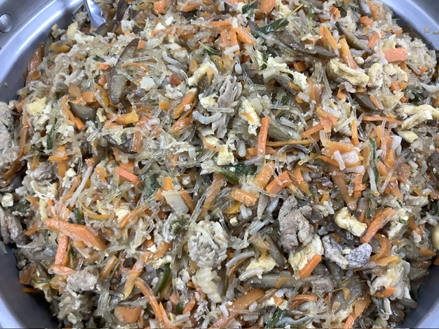 しらたき(誤嚥防止の為、短く切って提供しています)を乾煎りし(乾煎りをすることによって、こんにゃくの臭みをとったり、味が染み込みやすくなる)しらたきの水分が飛んだら、米油、生姜で香りをだして、肉の名門一真の豚肉、蒸しごぼう、35ファームのにんじん、ピーマン、油揚げの準備に次々と炒めていきます。調味料を加えて、春雨を入れ、蓋をして蒸し焼き状態にします。野菜から水分が出て、野菜の水分や旨味を春雨がたっぷり吸ってくれます。最後にごま油を回し入れて出来上がりです。