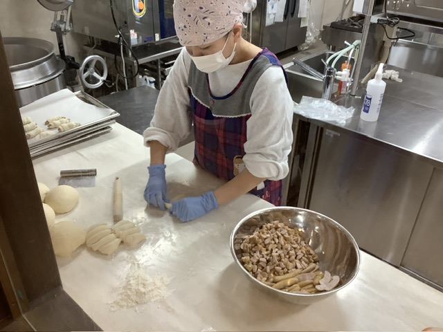 おやつが手作りパンの時は、朝一で生地を仕込み、子どもたちがランチルームで給食を食べている時にちょうど成形したりしています。