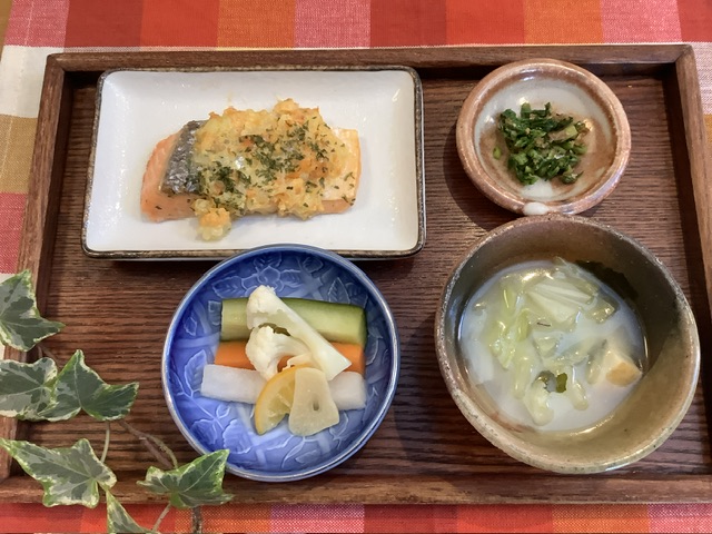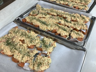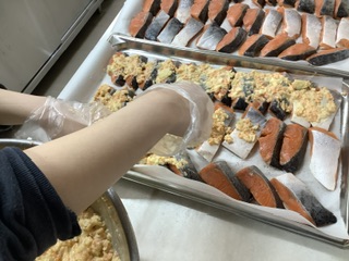 山口水産から新鮮な鮭が届きました。35ファームのじゃがいもをマッシュし、みじん切りにした人参と玉ねぎ、手作り豆乳マヨネーズを混ぜ合わせたものを鮭にのせ、焼き上げます。