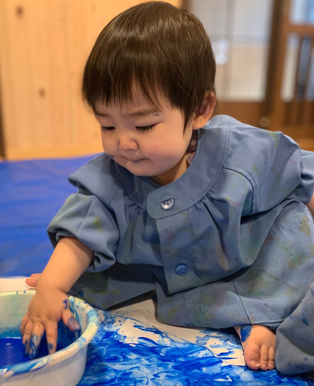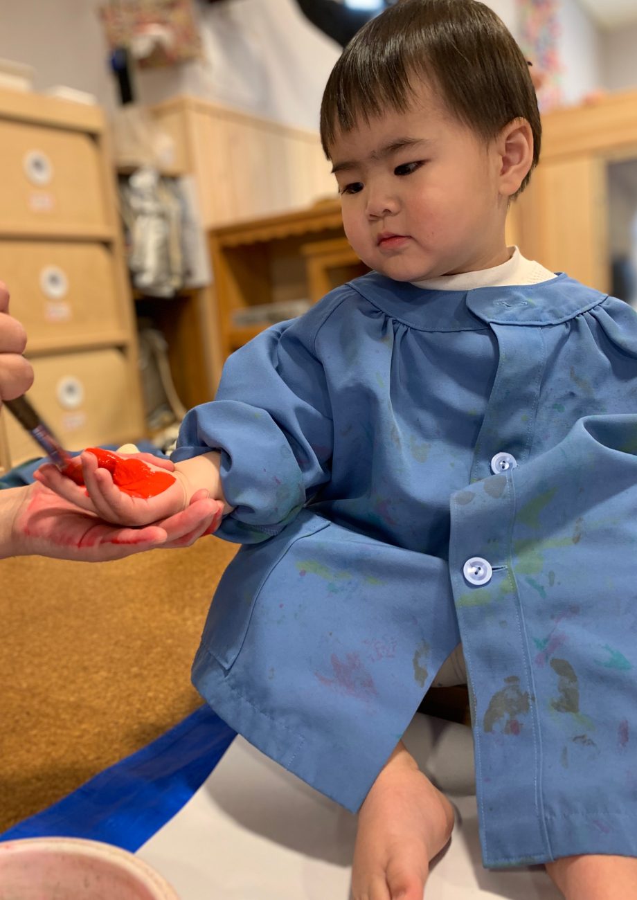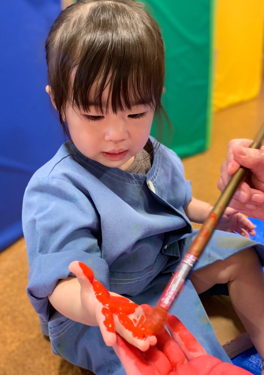 秋の頃は手が汚れることを嫌がり、険しい顔をしていた子も恐る恐る自分から手の平を差し出し、「もっと(筆で)色付けてー!」と催促。汚れても洗うときれいになった「経験」を通して苦手を克服している姿に成長を感じた瞬間でした。