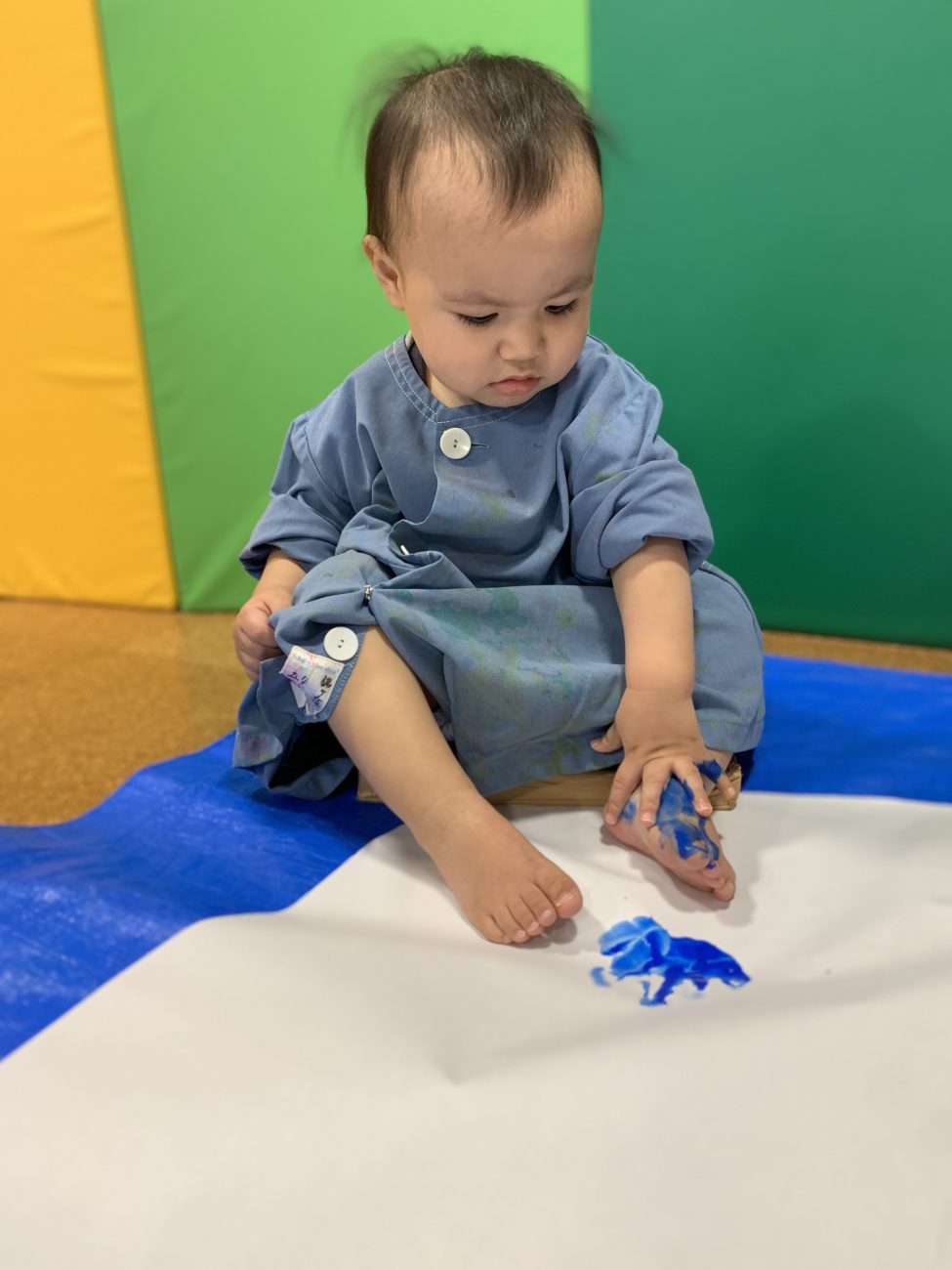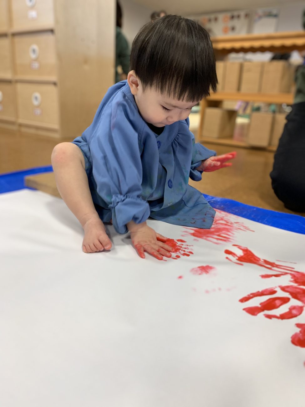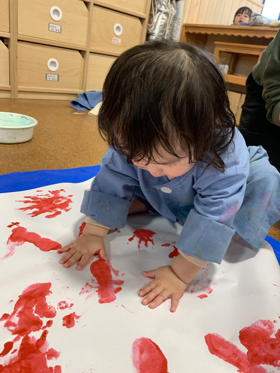 大人が筆で子ども達の手のひらや足の裏に絵の具を付け、ボディペイントをしました。「ぺったんぺったんするよ~」「歩いてもいいんだよ~」の声かけと同時に次々と手足を動かしていく子ども達。いつの間にか自分から丸いパレットの中に手足を突っ込んで大胆に色付けし、白い紙はあっという間に赤色と青色で塗られていきました。