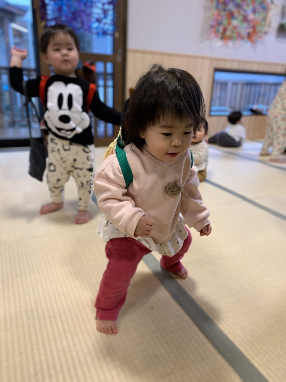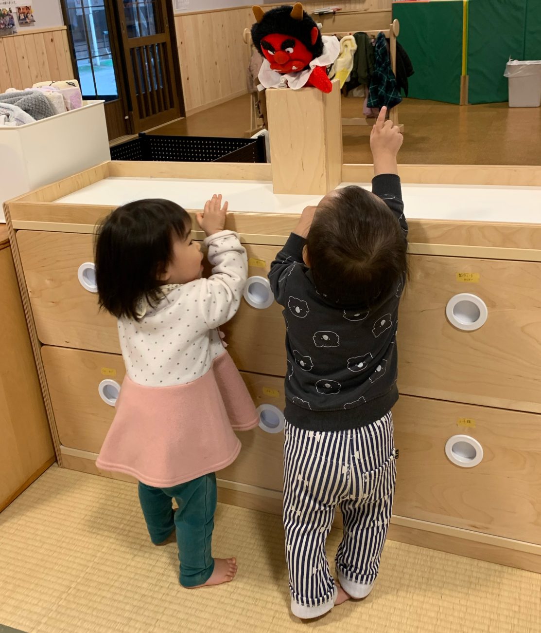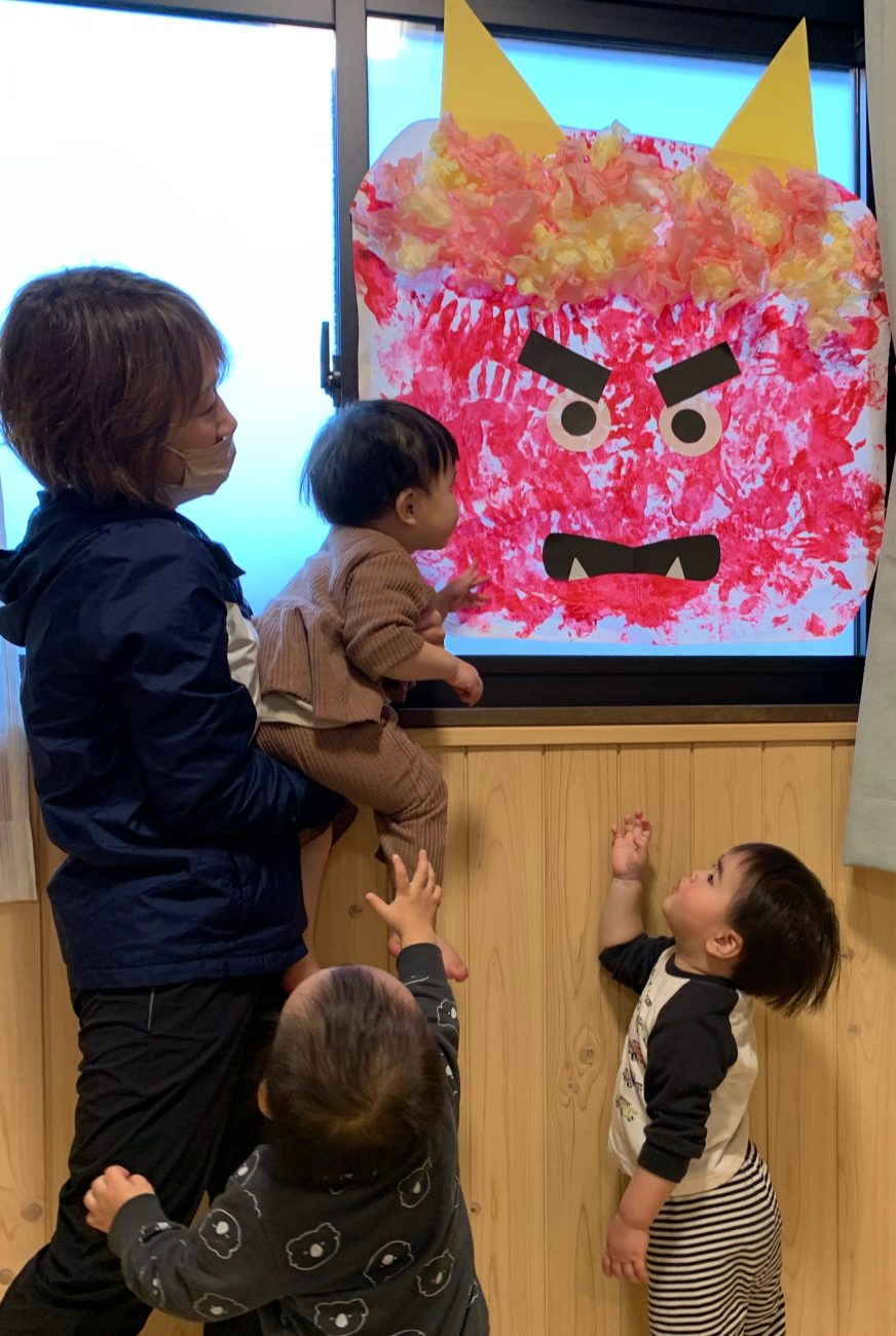 入園してからこれまでに、いろいろな季節の行事や風習に触れてきた子ども達。たくさんの初めてに出会い、経験したことで鬼と仲良くなるほどすっかり頼もしくなりました!友達にも関心を持ちはじめ、名前を覚えて声に出して呼ぶ姿も見られます。悪い鬼を追い払ったことですし、ますますみんなで仲良く、元気で楽しい毎日が過ごせるといいです。文責:上岡