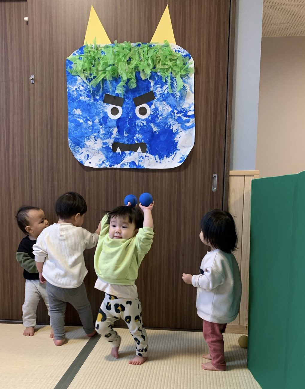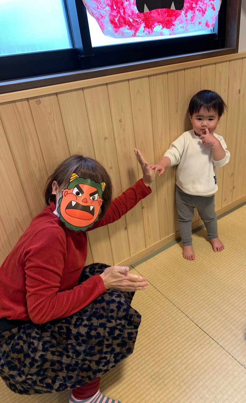 職員が鬼のお面を被って登場すると、鬼さんとタッチして、にこにこ微笑む子も。鬼さんとすっかり仲良くなったようです。
