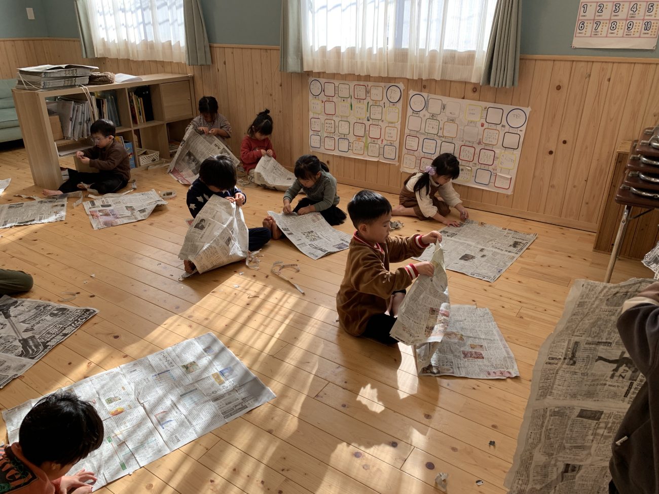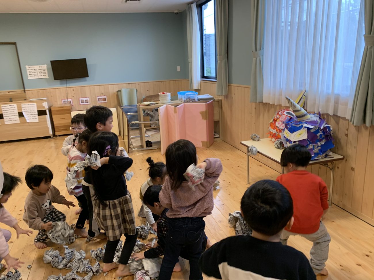 新聞紙遊びは、小さくちぎったり丸めたり畳んだりと指先を器用に使って遊びます。その中で指先の巧緻性を育み、集中する場面と発散する場面の切り替えも出来るようになってきます。また、新聞紙の素材にも注目し、破りにくい箇所・破りやすい箇所に気づきながら考えて取り組むことが出来るようになってきました。