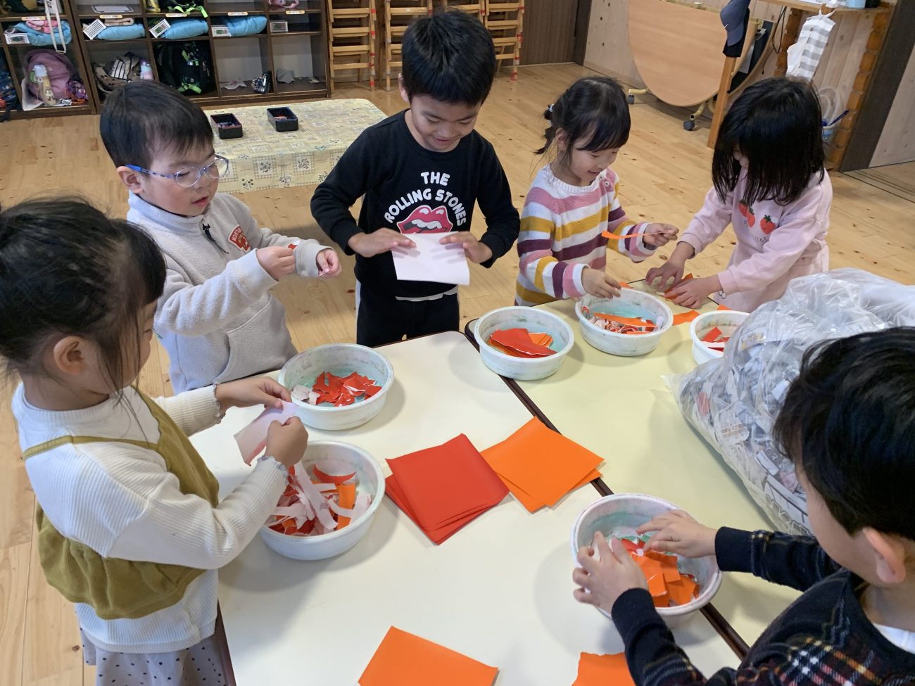 豆まきを通して”泣き虫鬼””怒りん坊鬼”など「心の中にある鬼」とも向き合うきっかけになったのではないかと思います。一年を通し、友達と一緒に一つの物をつくりあげる経験をすることで、自分の気持ちに折り合いをつけて友達の意見や考えを取り入れながら作ることが出来るようになってきました。
