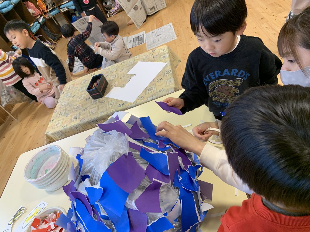 ちぎった折り紙を鬼の顔に見立てた、新聞紙を入れた袋に貼ります。