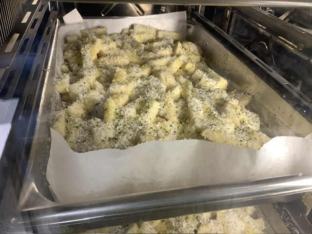 じゃがいもをスティック状に切り、オリーブオイル、塩こしょう、パン粉、パセリをまぶしてオーブンで焼き上げました。表面のパン粉はサクサク、じゃがいもはホクホク柔らかく美味しいベイクドポテトができました。