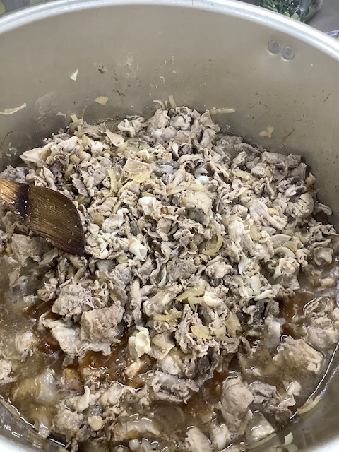 一真から届いた豚肩ロース肉を玉ねぎと炒めて、濃口醤油や味の母、きび糖を混ぜた調味だれを加え、お肉に絡めました。生姜は生のものをすりおろして使っているため、いい香りが広がります。