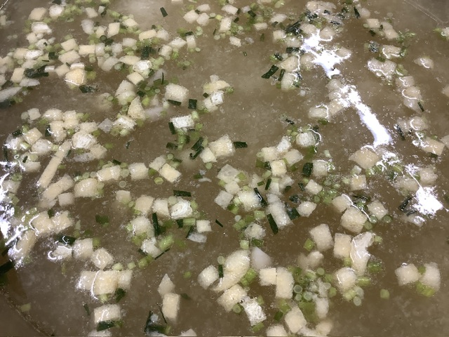 たっぷりのいりことかつお節で出汁をとり、里芋、しめじ、小ネギ、油揚げが入りました。