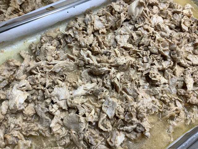 給食では、食材を炒め、調味料で味をつけたものとご飯を混ぜ込みました。