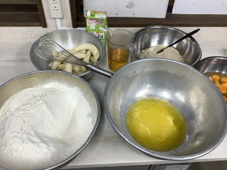 国産小麦粉、ベーキングパウダー、きび糖、豆乳、バター、ヤブサメファームの卵、たっぷりのバナナが入りました。