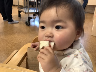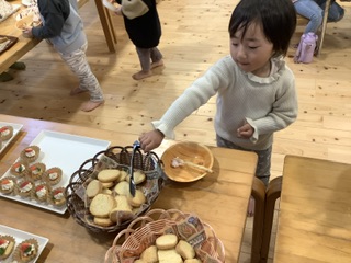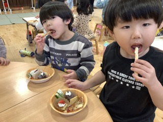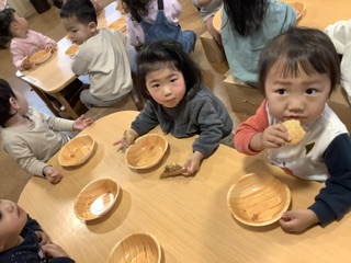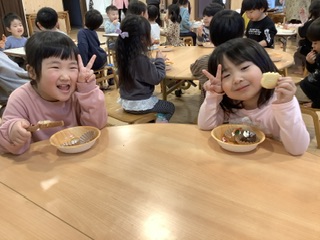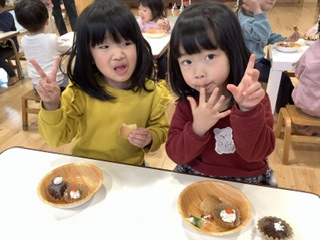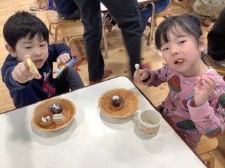 もうすぐ小学校に就学する年長組は、同じ小学校同士でテーブルを囲みました。一緒に楽しくおやつを食べることで、就学を見据えた交流ができたと思います。