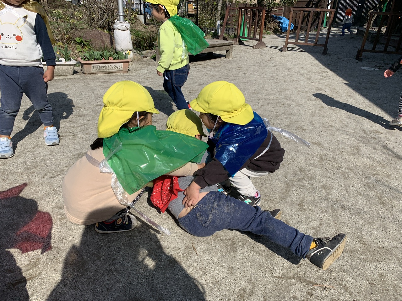泣いている子に「だいじょうぶ?」と駆け寄って涙を拭いてあげる・転んでいる人がいたら手を差し伸べて身体を起こしてあげるなど、こどもたちの世界観の中で、ヒーローのイメージを考えて戦うだけではなくこまっている人を助けるなど工夫しながら遊びを展開していきます。友だちとのやりとりに楽しさを感じ、自らわざと倒れて助けを求める役も生まれ、自分たちで遊びを主体的に展開していく姿はいきいきとしていました。
