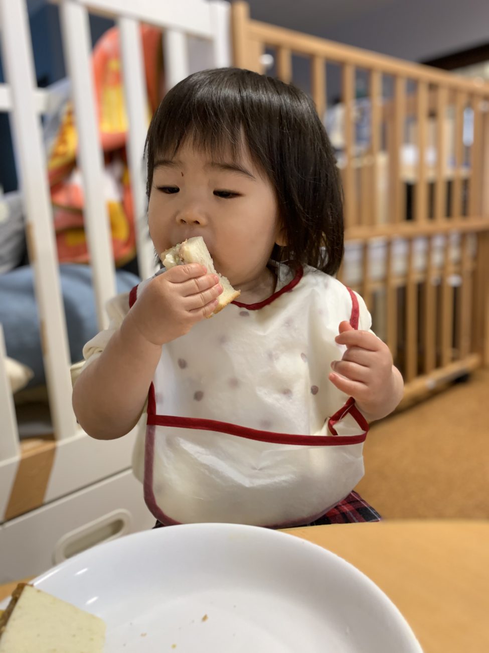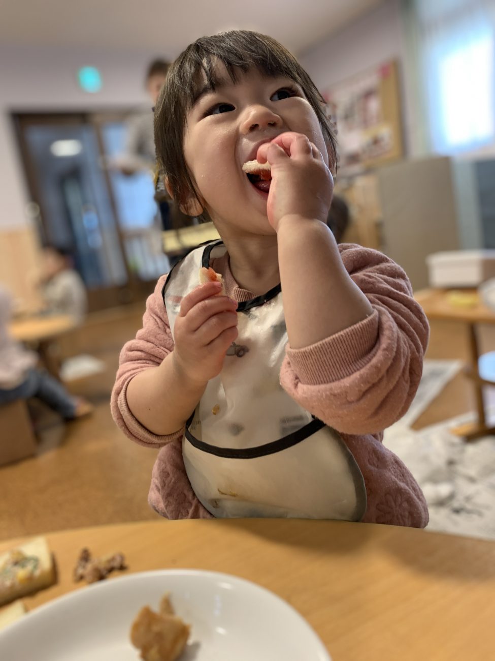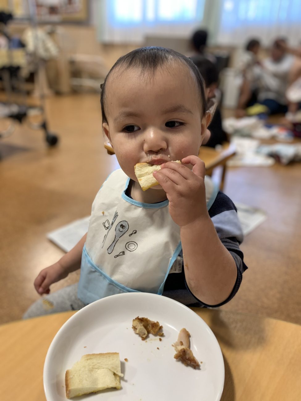 普通食に移行したての頃は、初めて触れる食材や味・感触に不安を抱き、警戒心から食材に触れようとしない姿もありました。しかし、砂(泥)遊び、水(氷)遊び、園庭の自然物などに触れて遊ぶことを通して、つるつる・どろどろ・ざらざらなどの感触を指先や手のひらで経験したことが手づかみ食べをする時の抵抗感を取り除くことに繋がり、今ではどんな食材も躊躇せずに触って口に入れることが出来るようになりました。友達が同じものを抵抗なく食べる姿を見て、食べてみよう!と手を伸ばすこともあります。触ることすら嫌がっていたのに…とその成長ぶりに心動かされる日々です。