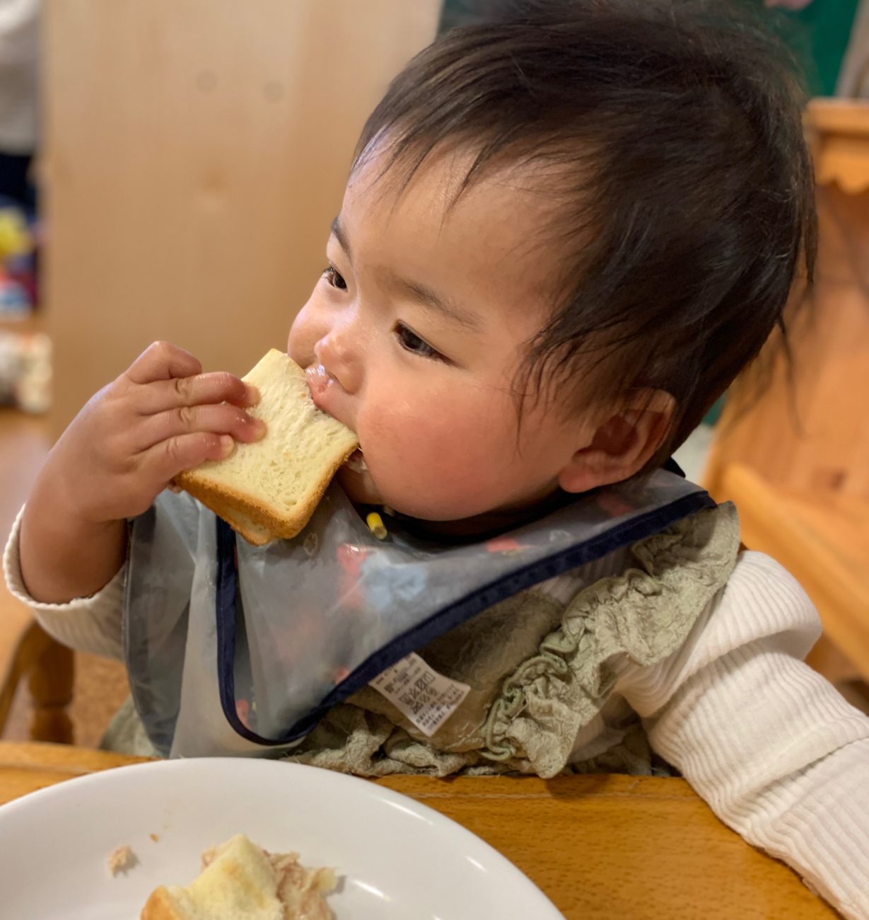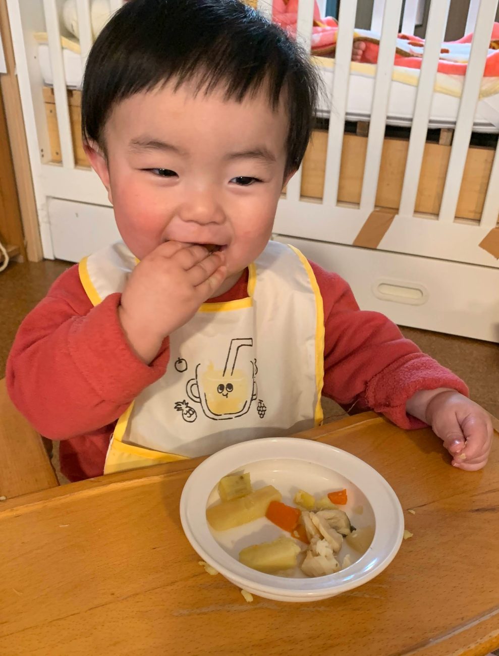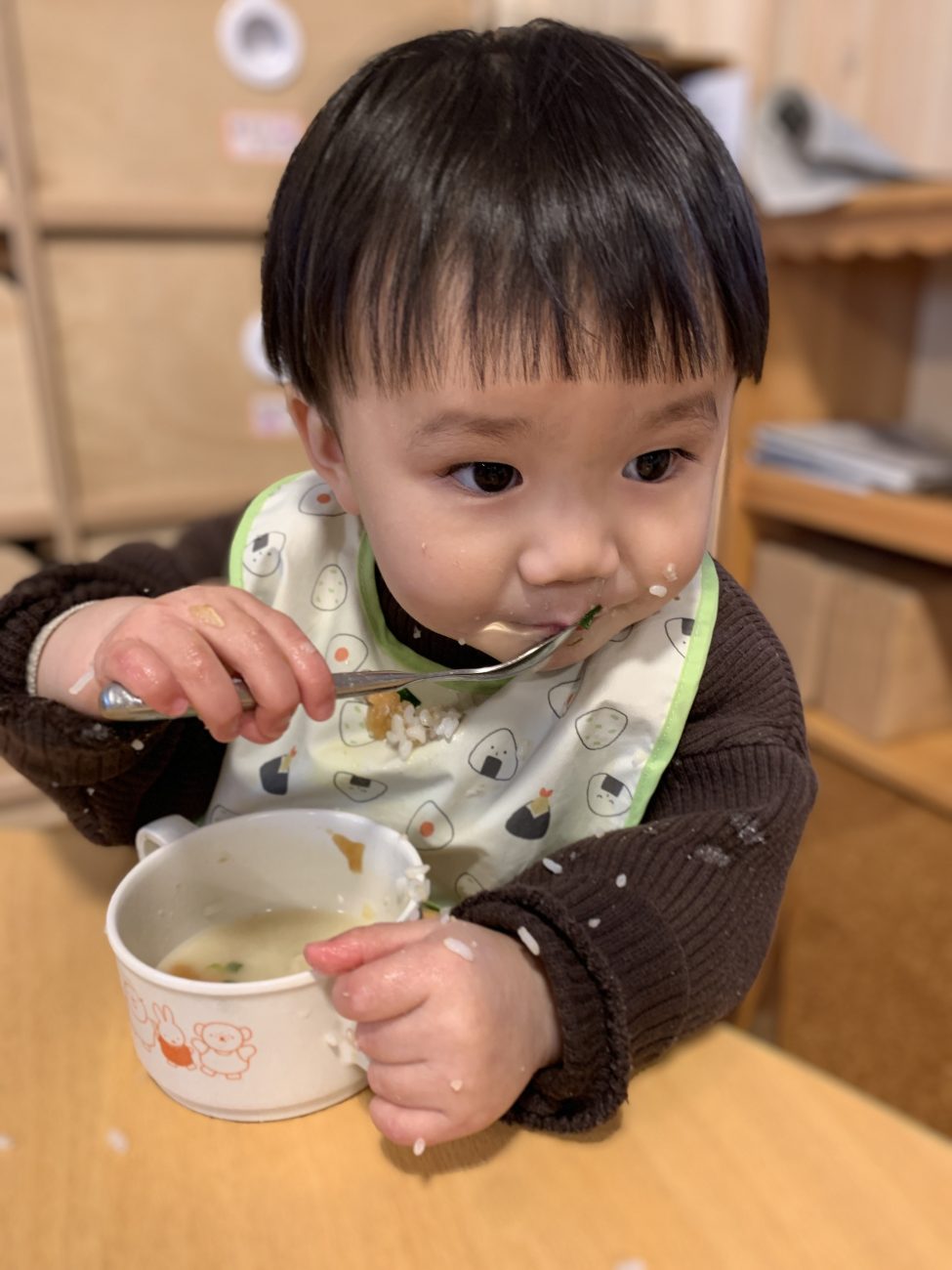 好きな味を知ったがゆえに、「今はこれじゃない!」と食べる前からお皿をどけたり、そっぽを向いて食べようとしなかったりする姿もあります。そんな時は強い味方の「お汁」です。子ども達はみんな、お汁が大好き。味噌汁であろうとスープであろうと、とにかくお汁を好んで飲んでくれます。先にお汁を目の前に置くと、すぐにスプーンで飲みはじめ、その延長でおにぎりにしたご飯を口にし、いつの間にかおかずもお皿から無くなっています。苦手な食材もお汁に浸しながらだと簡単に食べ終えています。