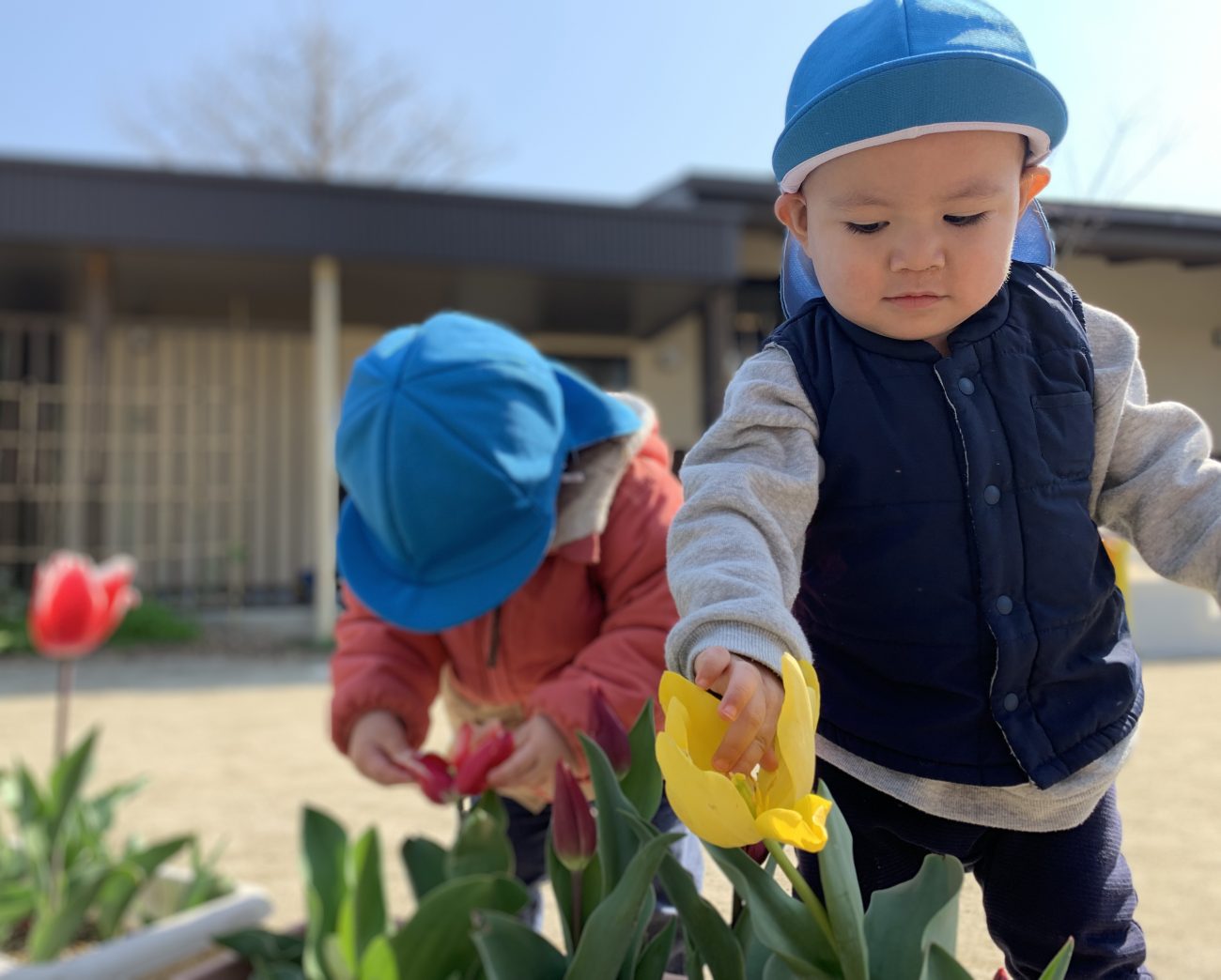 青色帽子の子ども達の居場所を確認すると…滑り台やチューリップが咲くプランター前、バイクや三輪車置き場の築山の左奥に駆け出す子、3,4,5歳児の玄関前にある壺のメダカを覗いている子、ビオトープの水を覗いて手足を浸している子と今までたくさんの経験した事を覚えていて、興味や行きたい場所を見つけて遊んでいます。