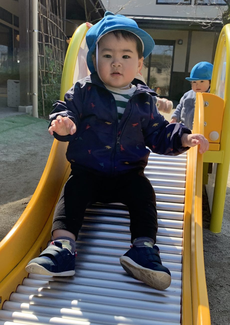 園庭の奥にある築山へも足を延ばし、一人が築山に向かうと”私も”とついて行く、”自分で上り下りするには?”と、つかまえる所を探す、お尻をつけて滑り下りる、急な斜面は手をついて上る等、それぞれが考えながら遊んでいることに気付かされます。
