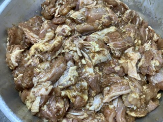一真から届いた鶏肉に、自家製醤油麹、ニンニクを漬け込みました。
