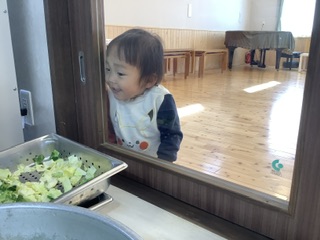 給食が楽しみなさくらんぼ組が覗きにきましたよ♪給食室を覗きこむと自然と笑顔になるこども達。。