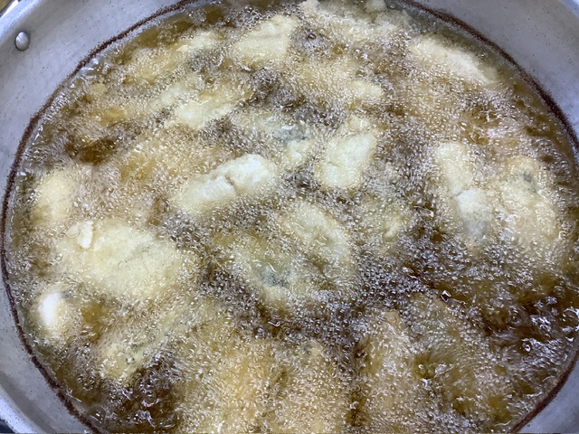 今回は、山口水産から届いた「ホキ」という種類の白身魚に塩こしょうで下味を付け、パン粉をまぶして油でカラッと揚げていきました。
