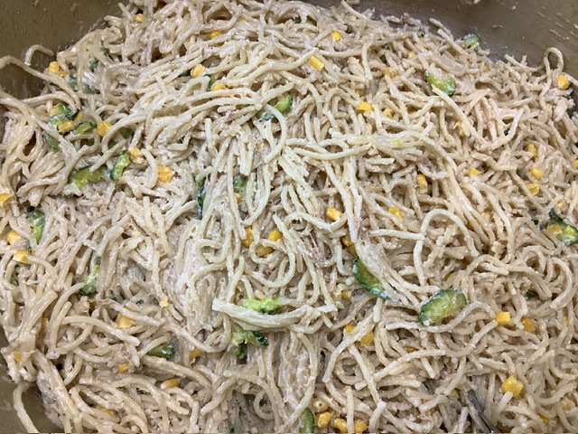 茹でたスパゲティに、きゅうり・ツナ・コーンを混ぜて、給食室手作りの豆乳マヨネーズで和えています。