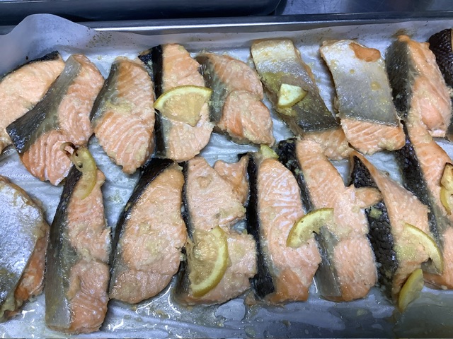 山口水産から届いた鮭を、にんにくとレモンで漬け込んでオーブンで焼き上げました。