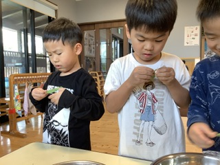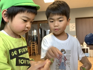 筋を探すのが少し難しい様子、、、皆、真剣です🫛