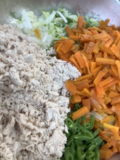 新玉ねぎ、早生キャベツ、人参、スナップエンドウ、一真から届いたささみを、手作り胡麻豆乳マヨネーズで和えました。