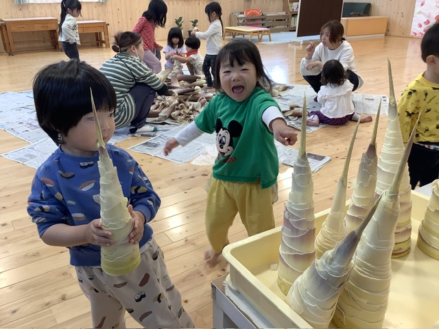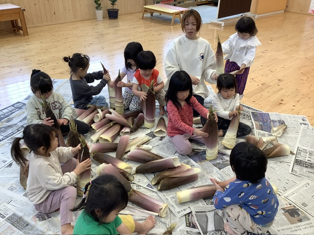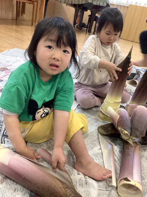 今日は、こども園営繕職員からたけのこを頂き、こども達とタケノコの皮剥きをしました。