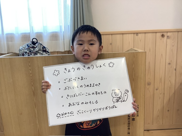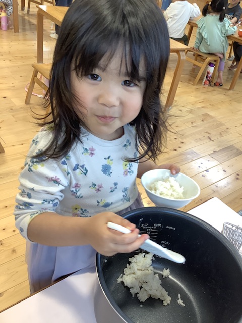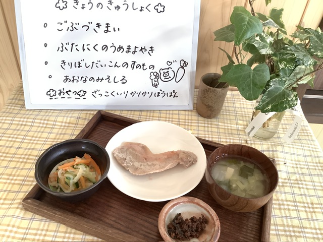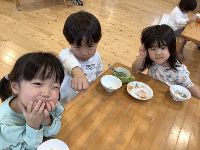 子ども達に「今日のお肉は、梅干しが入っていたんだけど、気付いたかな?」と聞いてみると「うん!ピンク色だったもん」と教えてくれました。食べる前に彩りなども気にしてくれているんだなぁ思いました⭐︎