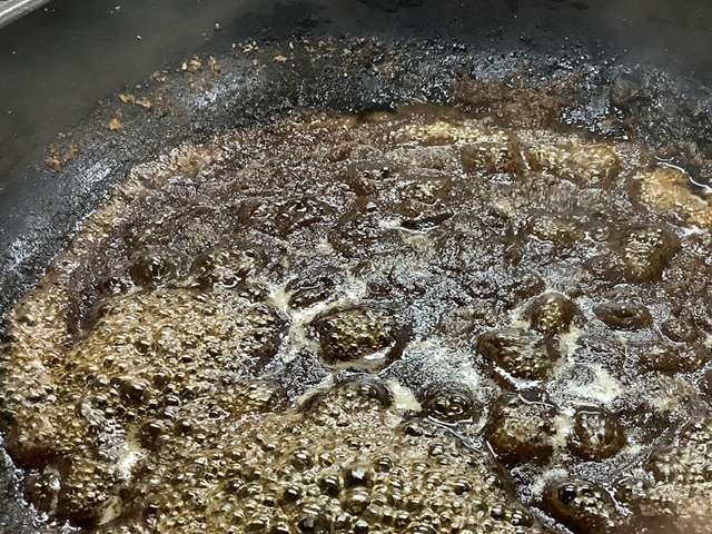 かつお節と濃口醤油・味の母・きび糖をフライパンに入れて、水分が飛ぶまで炒って作ります。