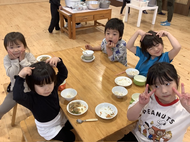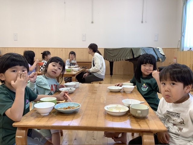 きく組、もも組、さくら組のこども達が一緒にランチルームで給食の時間を過ごしました。
