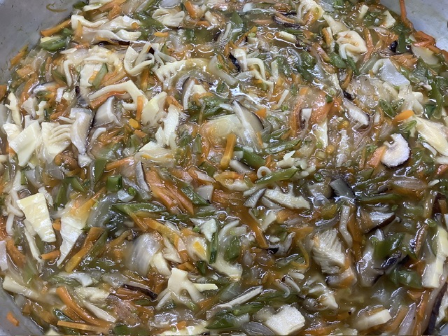 にんじん、干し椎茸、タケノコ、ピーマン、新玉ねぎ、スナップえんどうを全て千切りにし、調味料、片栗粉であんかけを作りました。