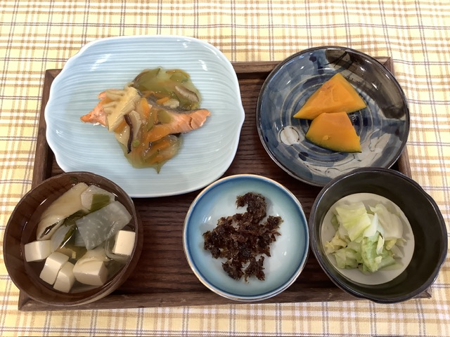 かぼちゃの煮物は、鰹昆布だしで出汁をとり、調味し落とし蓋をしてゆっくりと煮ました。
