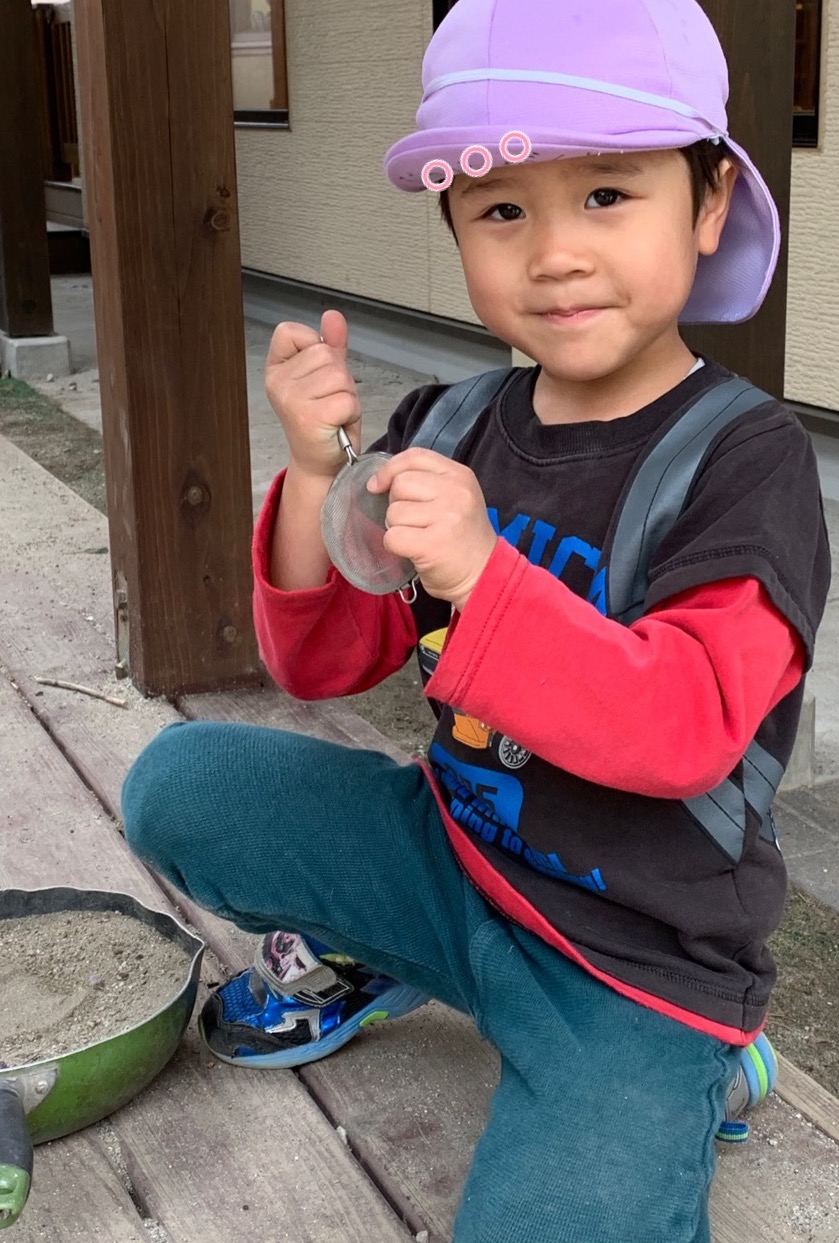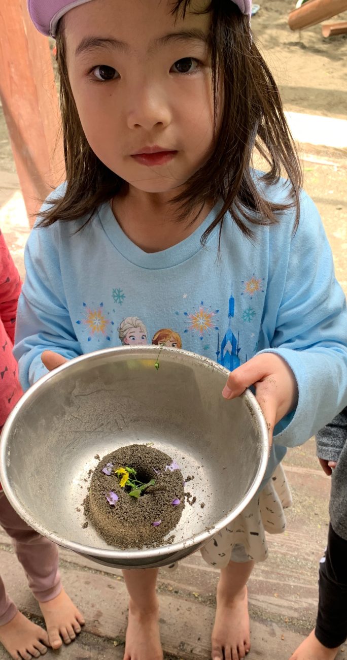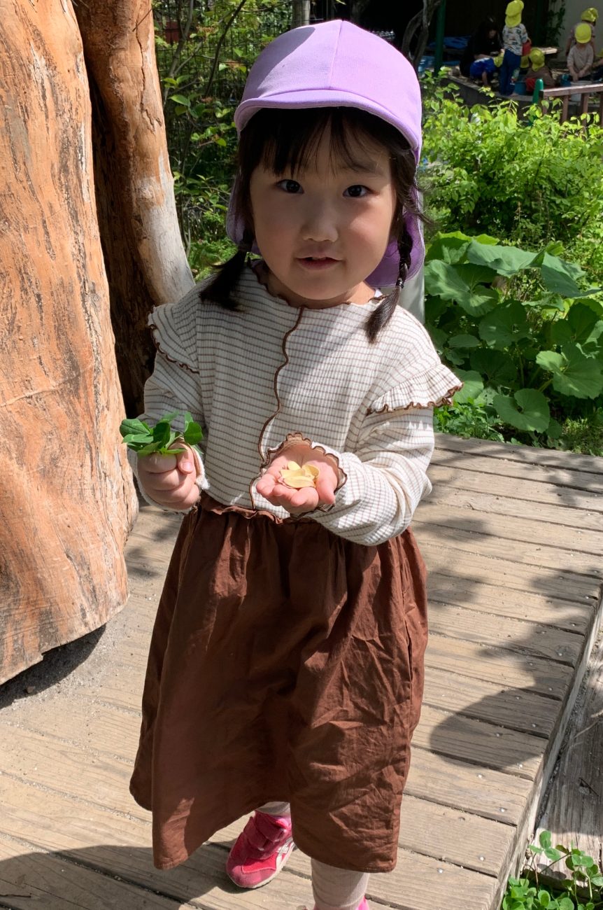 オガタマの木の花も大人気。「バナナの匂いがする!」「いや、リンゴの匂いだよ!」と言いながらその白い花びらを一枚ずつ拾い集めています。白やピンクのつつじの花をみて、「わぁ、きれいね~」と眺める姿もあります。様々な花びらをちぎって砂で作ったケーキにデコレーションしたりと、色とりどりの春を満喫中です。